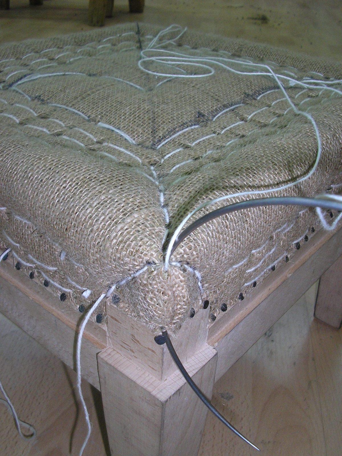 La mise en crin demande plus de dextérité et temps. Celui-ci devra être piqué au moyen d’aiguilles courbes et de ficelle pour donner sa forme définitive à la garniture. - La pose d’une toile blanche et d’une ouate servira à préserver ce crin, éviter qu’il ne traverse l’étoffe, ou la mousse, ceci avant la pose définitive du tissu de couverture décoratif.